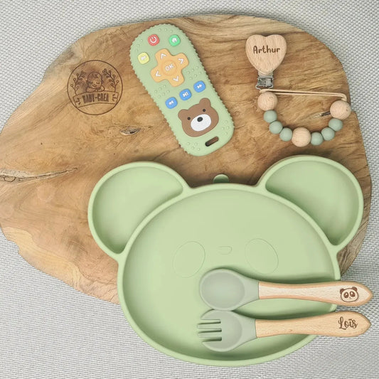 Coffret repas bébé personnalisé – Assiette ourson et accessoires gravés