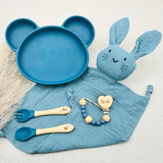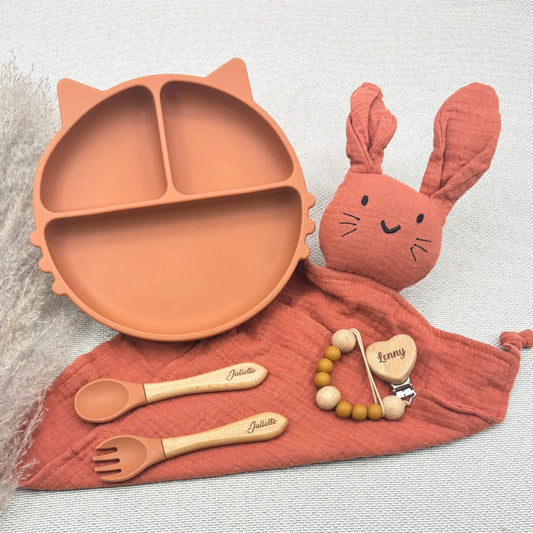Coffret repas bébé personnalisé – Assiette chat, doudou lapin, attache tétine & couverts gravés