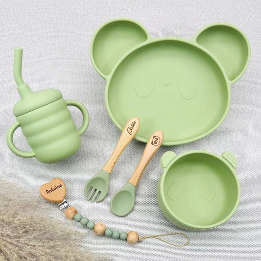 Coffret repas bébé personnalisé – Assiette panda silicone et accessoires